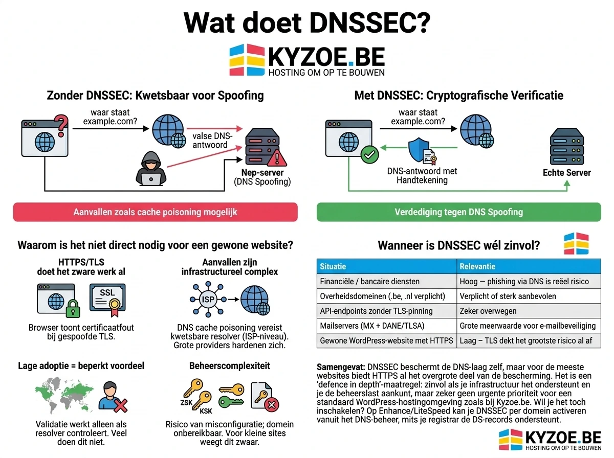 DNSSEC beschermt de DNS-laag zelf, maar voor de meeste websites biedt HTTPS al het overgrote deel van de bescherming die DNSSEC zou toevoegen. Het is een “defence in depth”-maatregel: zinvol als je infrastructuur het ondersteunt en je de beheerslast aankunt, maar zeker geen urgente prioriteit voor een standaard WordPress-hostingomgeving zoals bij Kyzoe.be.